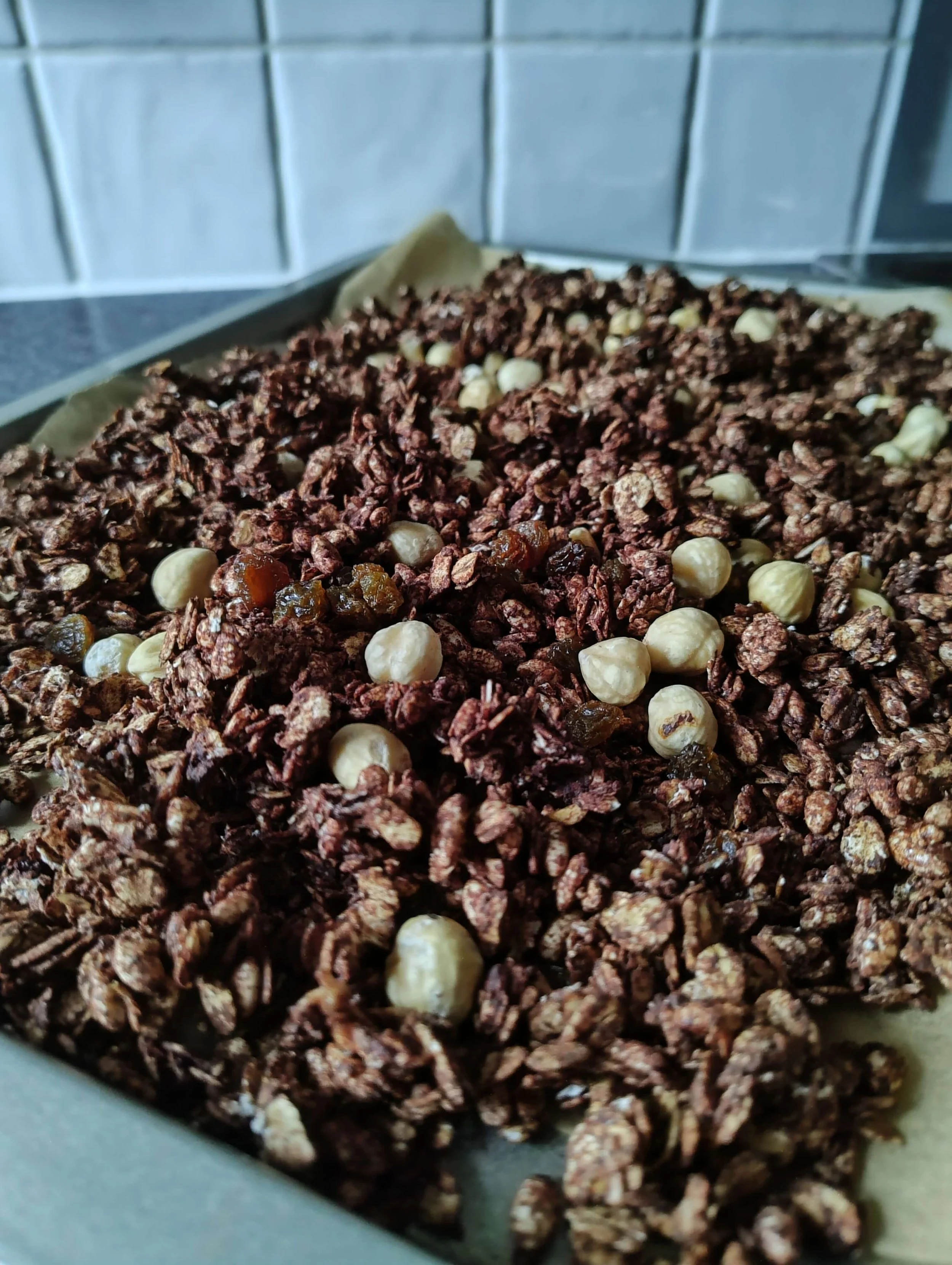 8. Break up the granola into clusters and stir through the roasted nuts and dried fruit.